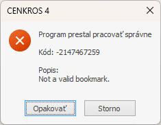 Ak sa po spustení programu Rozpočty a kalkulácie CENKROS 4 o chvíľu sám zavrie bez chybovej hlášky (nespustí sa vôbec), alebo zahlási chybové hlásenie Program prestal pracovať správne Kód: -2147467259, najčastejšie je to spôsobené chybou Microsoft Access database engine 2010.