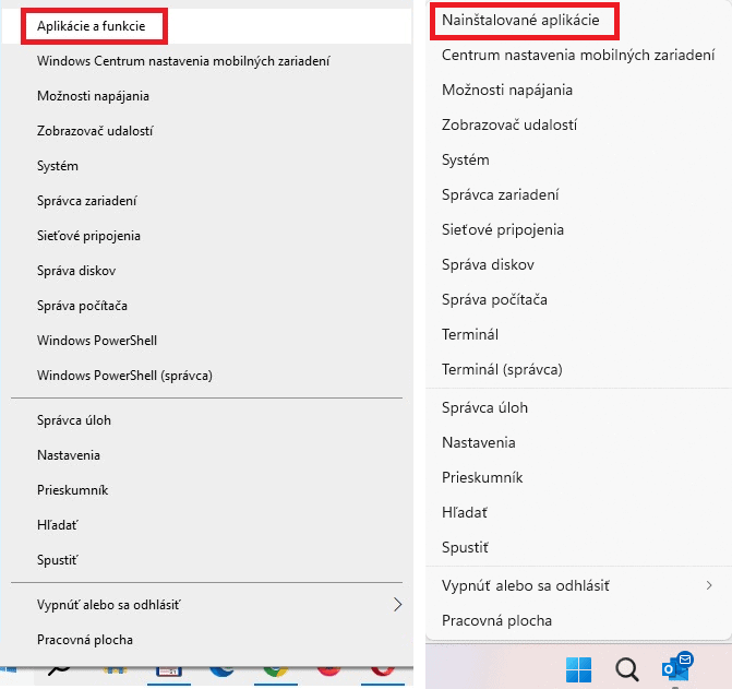 Nastavte sa na ikonu Štart a stlačte pravé tlačidlo na myši. Vyberte prvú možnosť z menu Win10: Aplikácie a funkcie, Win11: Nainštalované aplikácie.