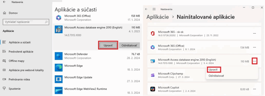 Pre Win10: kliknite na aplikáciu, Win11: kliknite na 3 bodky na konci riadku. Objaví sa možnosť Upraviť – kliknite na to. Potvrďte inštaláciu (prípadne odklikajte kroky inštalácie možnosťou Next.