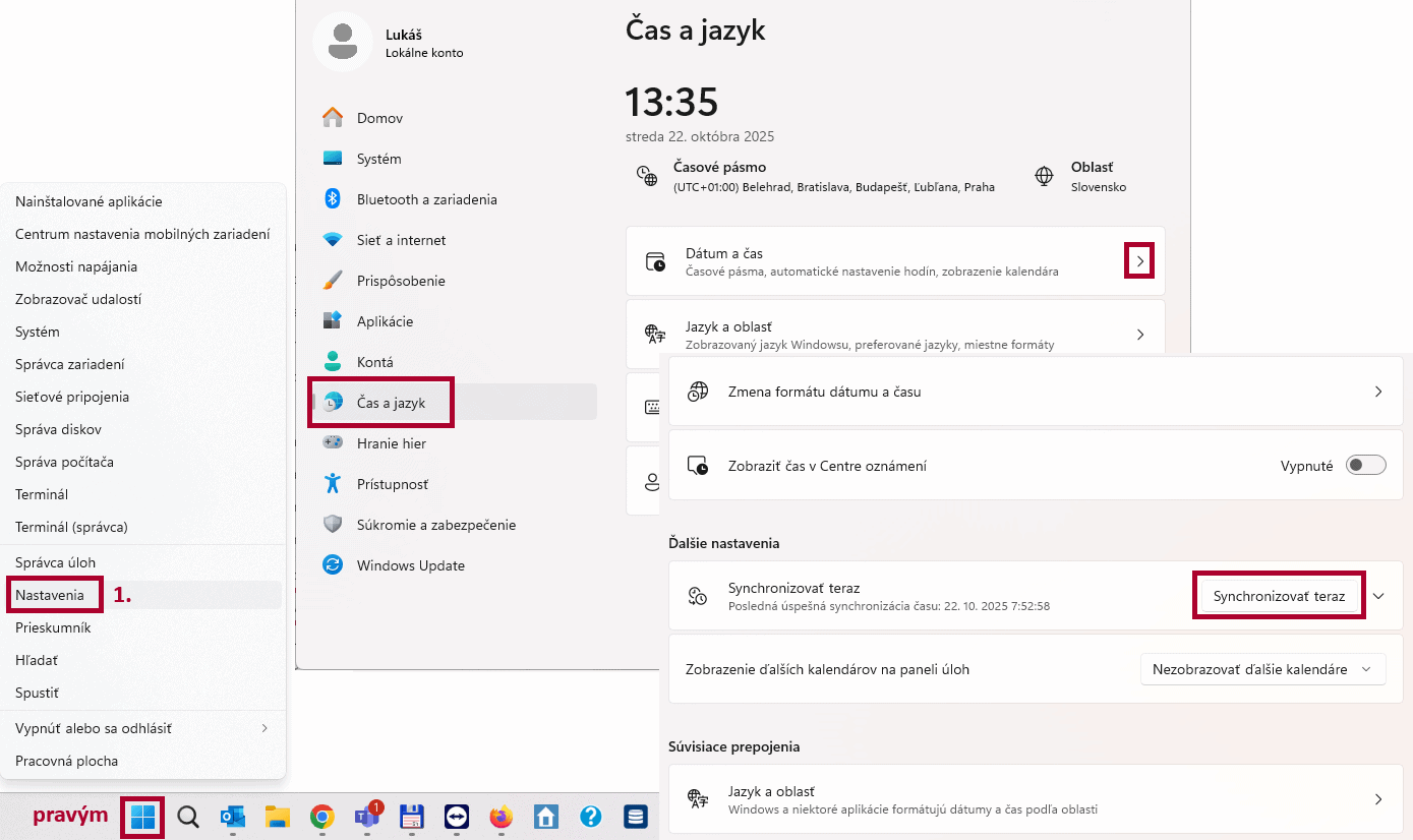 Zosynchronizujte si čas (napr. pre Windows 11: pravým tlačidlom myši na Štart – Nastavenia – Čas a jazyk – Dátum a čas -Synchronizovať teraz) a spustenie zopakujte. Ak aj potom Rozpočty a kalkulácie CENKROS 4 hlási chybu, volajte na HOTLINE Stavebných riešení.