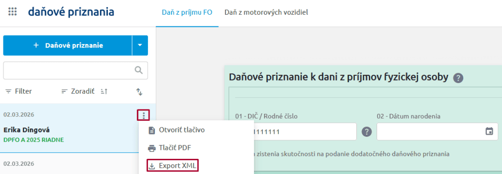 - Export do XML vytvoríte v aplikácii KROS Daňové priznania a to kliknutím na tlačidlo s troma bodkami, kde zvolíte Export XML. Súbor sa uloží do stiahnutých súborov vo vašom PC.