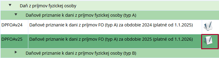 - V zobrazenom zozname elektronických formulárov rozkliknite Daňové priznanie k dani z príjmov fyzickej osoby (typ A).