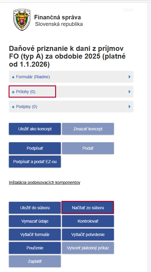 - Ak súčasne s daňovým priznaním posielate aj prílohy napr. potvrdenie o zdaniteľných príjmov alebo iný doklad, tieto doklady zoskenujte a načítajte cez Prílohy (v ľavej časti).