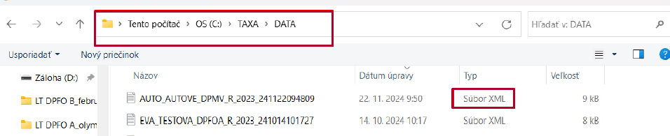 Vyberieme cestu vo Vašom PC, kde sú daňové priznania uložené. Súbory vo formáte XML sa štandardne ukladajú vo Vašom PC na C:\TAXA\DATA.