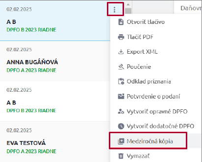 Následne je možné z naimportovaných DP vytvoriť medziročnú kópiu cez menu tri bodky. Daňové priznanie bude zobrazené v editovateľnom tlačive.