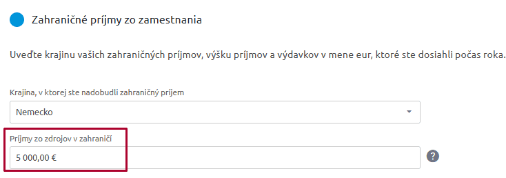 Zahraničné príjmy vyplníte v sprievodcovi neskôr. Ak by ste sumu neodpočítali, boli by uvedené duplicitne.