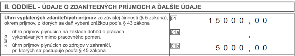 V tomto prípade vyplníte sumu očistenú o zahraničný príjem t.j. (15.000 – 5.000 = 10.000)