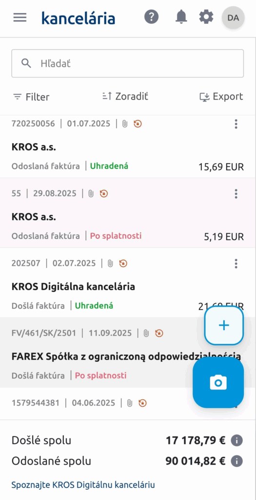 Aplikácia KROS Digitálna kancelária doklady automaticky spracuje a každú prílohu zaeviduje ako nový záznam.
