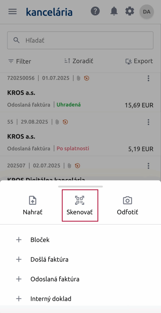 - Po jeho zoskenovaní aplikácia ponúkne možnosť odfotiť originál bločku. Ak ho odfotíme, automaticky sa uloží do KROS Digitálnej kancelárie v záložke Účtovné doklady.