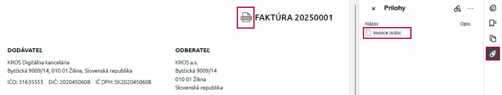 To, či faktúra vo formáte .pdf obsahuje prílohu ISDOC, zistíme po otvorení dokumentu. V aplikácii Adobe Acrobat Reader klikneme v pravej časti na ikonu sponky, ktorá zobrazí prílohy súboru.