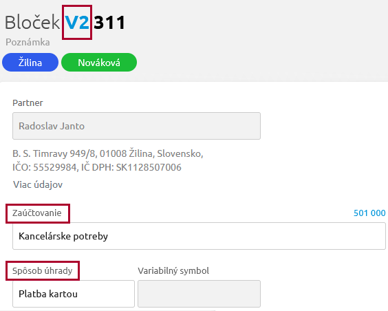 Údaje načítané z QR kódu, ktorý bloček obsahuje, sú needitovateľné. Možné je iba nastaviť zaúčtovanie pre Podvojné účtovníctvo OMEGA a meniť spôsob úhrady. Ak používame v Podvojnom účtovníctve OMEGA viac číselných radov (napr. účtujeme viac pokladníc), môžeme v KROS Digitálnej kancelárii konkrétnemu bločku nastaviť iný číselný rad (na obrázku nižšie použitý číselný rad V2), do ktorého bude v účtovníctve importovaný.