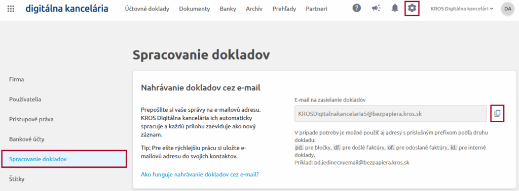 V časti Nastavenia – Spracovanie dokladov nájdeme preddefinovanú e-mailovú adresu pre zasielanie dokladov prostredníctvom e-mailu.