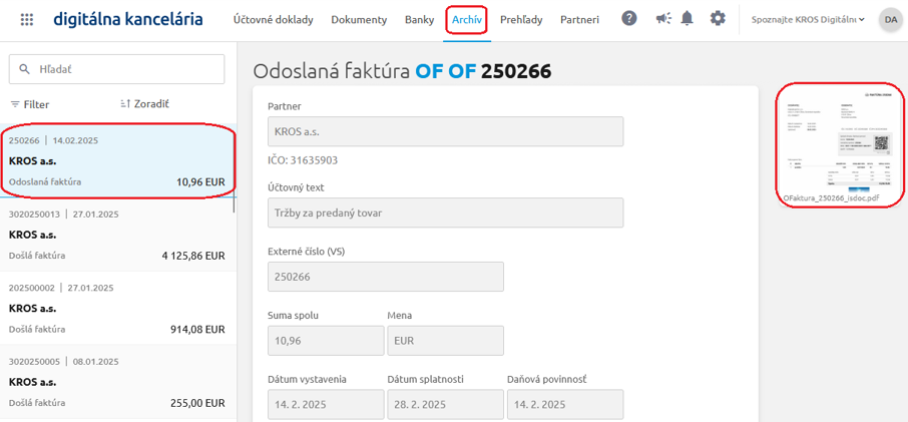Odosielanie informácií do KROS Digitálnej kancelárie prebieha automaticky približne každých 5 minút. Následne sa doklad zobrazí v záložke Archív v KROS Digitálnej kancelárii. Tu je možné doklady prezerať, filtrovať, zoraďovať, otvoriť si prílohu a prípadne si ju stiahnuť.