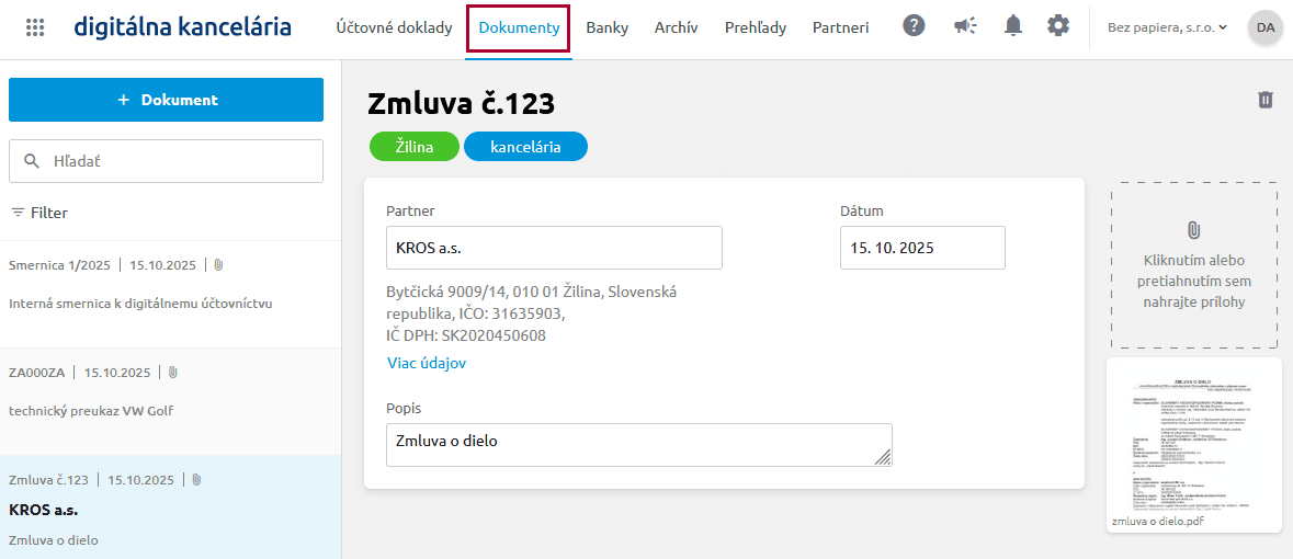 V tejto časti KROS Digitálnej kancelárie je možné ukladať si akékoľvek neúčtovné doklady, ktoré potrebujeme mať pri svojej práci kedykoľvek po ruke, napr. zmluvy, poistky, smernice, certifikáty, splátkové kalendáre, technické preukazy, dodacie listy atď.