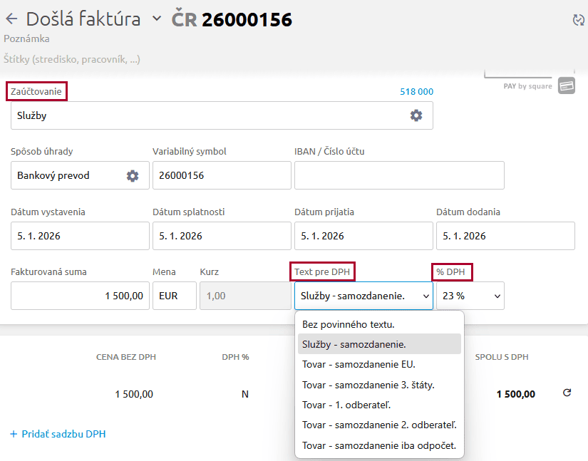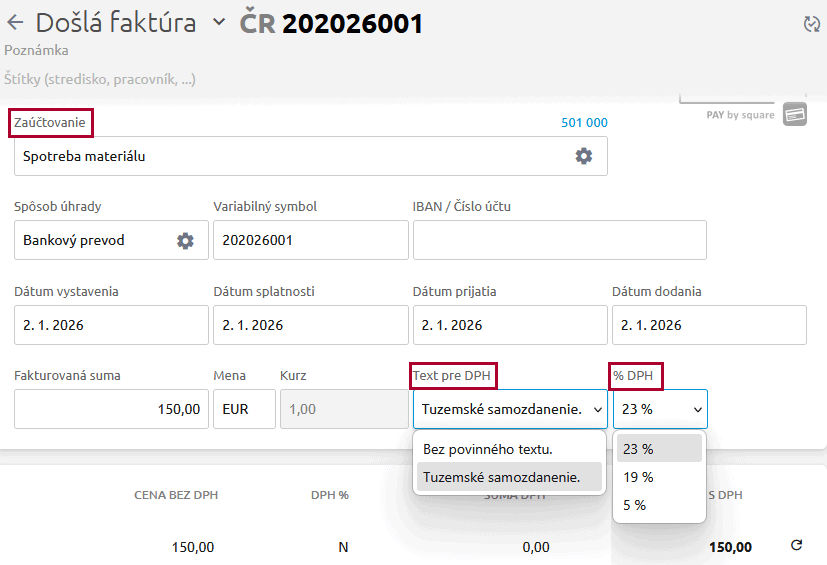 Pre došlé faktúry, ktoré podliehajú tuzemskému prenosu daňovej povinnosti, nastavíme pre ich korektné zaúčtovanie v účtovníctve vybrané zaúčtovanie, text pre DPH „Tuzemské samozdanenie“ a % DPH pre samozdanenie.