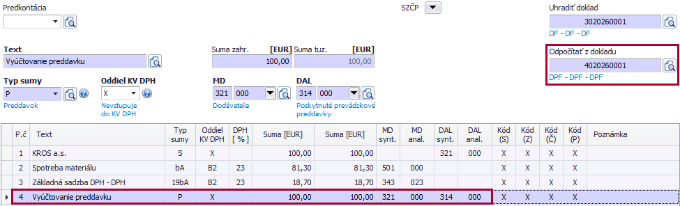 Doklad sa do účtovníctva stiahne spolu s účtovným zápisom pre odpočítanie preddavku. Do bunky Odpočítať z dokladu je pre správne vysporiadanie dokladov v saldokonte potrebné doplniť príslušnú preddavkovú faktúru alebo BV, ak preddavkovú faktúru neevidujeme.