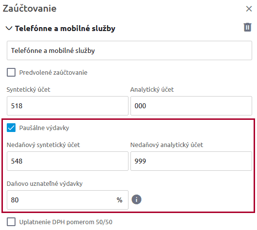 Ak chceme pri telefónnych a mobilných službách uplatniť paušálne výdavky vo výške 80 %, zadáme hodnotu 80 pre daňovo uznané výdavky. Zvyšných 20 % bude predstavovať nedaňový výdavok a pre korektné zaúčtovanie je potrebné nastaviť nákladový účet, ktorý je aj v programe Podvojné účtovníctvo OMEGA v účtovom rozvrhu nastavený ako nedaňový.