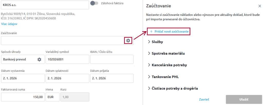 Najbežnejšie používané spôsoby zaúčtovania sú v KROS Digitálnej kancelárii už preddefinované, zvlášť pre Bločky, zvlášť pre Došlé faktúry, zvlášť pre Odoslané faktúry a zvlášť Interné doklady. V prípade, že chceme doplniť vlastné možnosti, stačí v rámci konkrétneho typu dokladu kliknúť na tlačidlo Nastavenie (ozubené koliesko) a následne časti Zaúčtovanie vybrať možnosť Pridať nové zaúčtovanie. Tu si vyplníme vlastný text a účet, na ktorý sa má doklad po prenose do účtovníctva rozúčtovať.