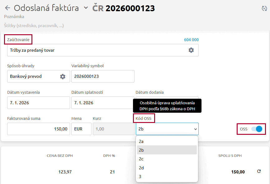 Následne sa pri načítaní odoslaných faktúr pre nezdaniteľné osoby z krajín EÚ (mimo SR) automaticky zapne príznak OSS a nastaví Kód OSS 2b. Uvedený kód môžeme v prípade potreby zmeniť. So súčasným nastavením Zaúčtovania sa doklad do programu Podvojné účtovníctvo OMEGA importuje automaticky zaúčtovaný.
