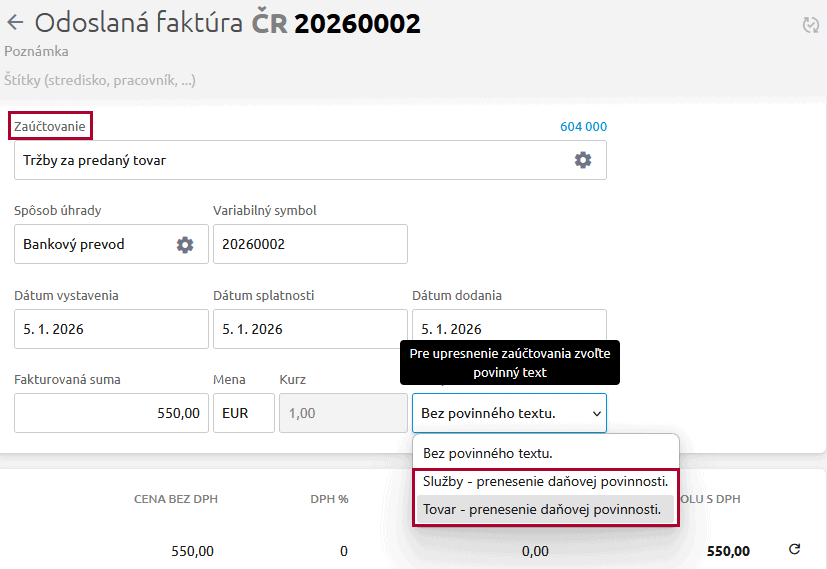 Pre zahraničné odoslané faktúry, na ktorých fakturujeme tovar oslobodený od daňovej povinnosti, nastavíme vybrané zaúčtovanie a text pre DPH „Tovar – prenesenie daňovej povinnosti“. Pre služby vyberáme text pre DPH „Služby – prenesenie daňovej povinnosti“.