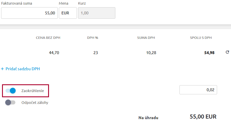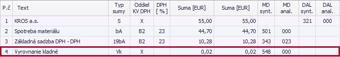 Ak sme na faktúre v KROS Digitálnej kancelárii nastavili zaokrúhlenie dokladu, po stiahnutí do programu Podvojné účtovníctvo OMEGA sa doklad zaeviduje s upravenými hodnotami. V účtovnom zápise bude nastavený Typ sumy Vk alebo Vz podľa toho, či ide o vyrovnanie kladné alebo záporné. Tieto údaje po stiahnutí neodporúčame meniť.
