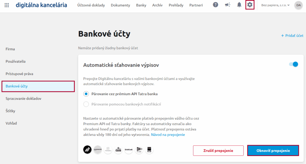 V KROS Digitálnej kancelárii prepojenie obnovíte v časti Nastavenia – Bankové účty cez možnosť Obnoviť prepojenie.