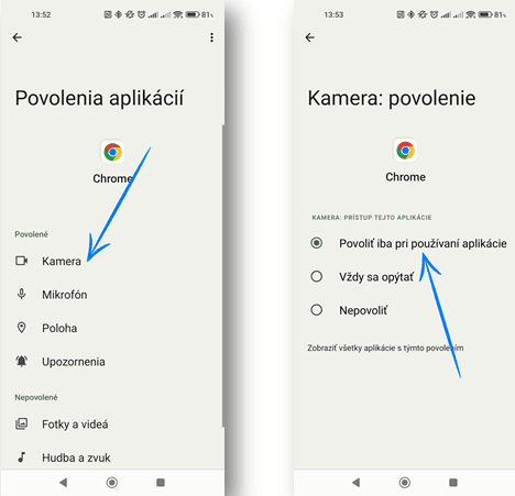 V mobilnom telefóne prejdeme do menu Nastavenia – Aplikácie – Spravovať aplikácie a vyhľadáme aplikáciu Chrome. Klikneme na ňu. Následne zvolíme Povolenia aplikácie – Kamera a povolíme prístup prehliadaču Chrome ku kamere (fotoaparátu) zariadenia.