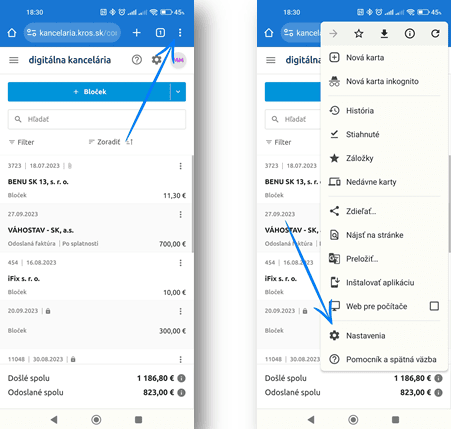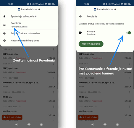 - aplikácii KROS Digitálna kancelária v prehliadači Chrome (aby prehliadač Chrome povolil aplikácii KROS Digitálna kancelária používať fotoaparát),