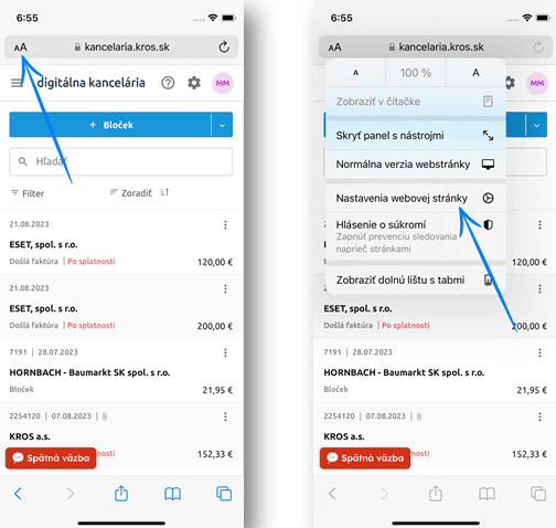 - aplikácii KROS Digitálna kancelária v prehliadači Safari (aby prehliadač Safari povolil aplikácii KROS Digitálna kancelária používať fotoaparát),