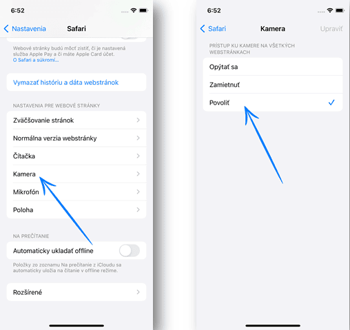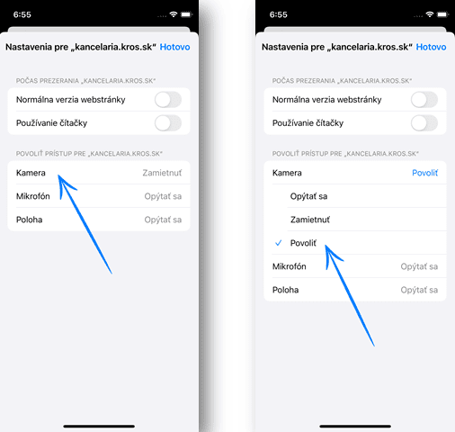 - prehliadaču Safari v systéme iOS (aby operačný systém iOS povolil prehliadaču Safari používať fotoaparát).