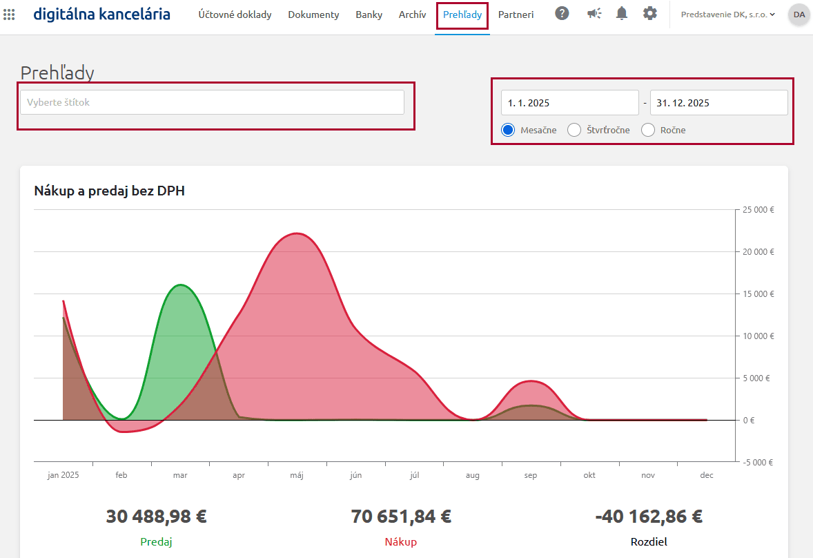V predvolenom zobrazení vidíme prehľad o našej firme za aktuálny rok a zahŕňa doklady evidované v záložke Účtovné doklady. Po výbere štítku, prípadne i kombinácie viacerých, sa graf automaticky aktualizuje. Taktiež si môžeme zobraziť prehľad za zvolené obdobie nastavením príslušných dátumov, prípadne zobraziť mesačný, kvartálny alebo ročný graf.