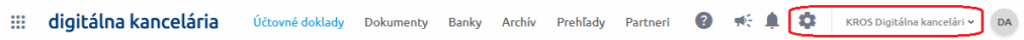 Nového používateľa pridávame priamo vo webovej aplikácii https://kancelaria.kros.sk cez Nastavenia (ozubené koliesko) v pravej hornej časti formulára a výbere záložky Používatelia.
