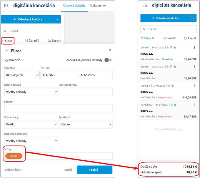 Doklady, v ktorých sú štítky použité, môžeme v záložke Účtovné doklady alebo Dokumenty jednoducho filtrovať. V časti Filter nájdeme možnosť filtrovať konkrétny štítok. Po potvrdení sa následne zobrazia vybrané doklady a zároveň ich sumár v členení podľa typu dokladu.