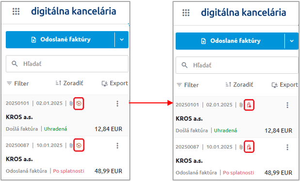Po vytvorení uzávierky DPH v účtovnom programe sa v KROS Digitálnej kancelárii automaticky zobrazí hláška o potrebe obnovy stránky. Oranžový príznak uzamknutia sa na príslušných dokladoch po jej potvrdení automaticky zmení na červený.