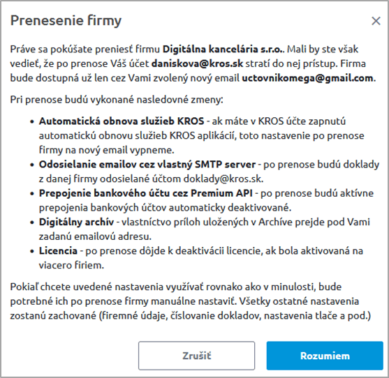 Zmenou vlastníka sa firma prenesie pod iný aktívny KROS účet, pričom sa prenesie celá firma, tzn. KROS Digitálna kancelária, KROS Firma, KROS Fakturácia aj KROS Sklad.