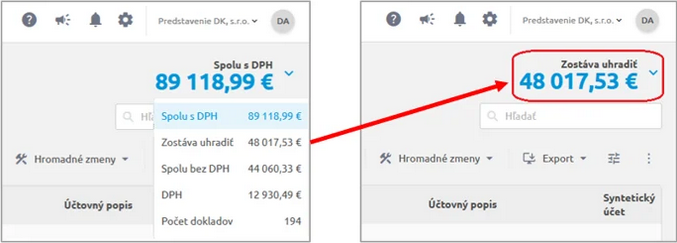 V pravom hornom rohu nájdeme informáciu o celkovom súčte zobrazených dokladov. Kliknutím na ikonu šípky sa otvorí detailnejší prehľad a ak si vyberieme konkrétny riadok, napr. Zostáva uhradiť, prenesie sa do základného zobrazenia.