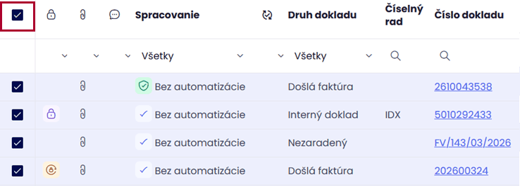 - Hromadné označenie vykonáme kliknutím do štvorčeka v prvom stĺpci zľava v hlavičke tabuľky. Označenie sa vykoná na všetkých zobrazených dokladoch.