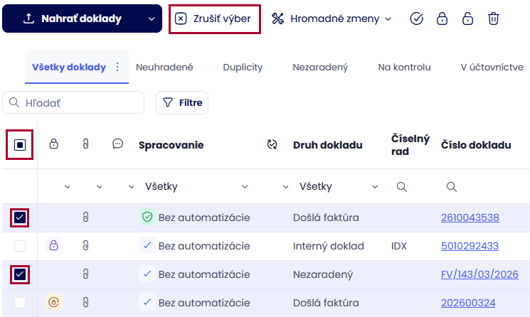 - kliknutím na možnosť Zrušiť výber v pravej hornej časti nad zoznamom dokladov,