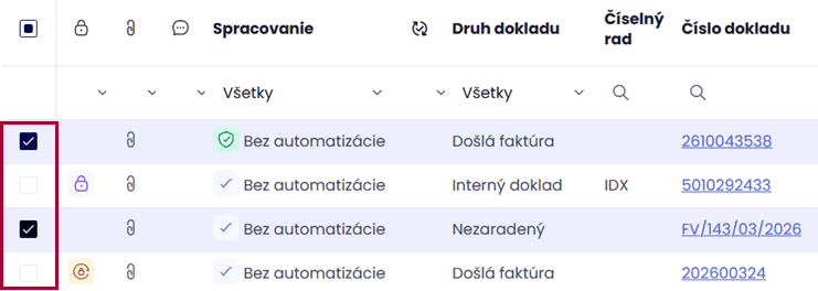- Postupné označovanie robíme pri vybraných dokladoch kliknutím do prázdneho štvorčeka v prvom stĺpci zľava, ktorý je pre túto funkciu určený.