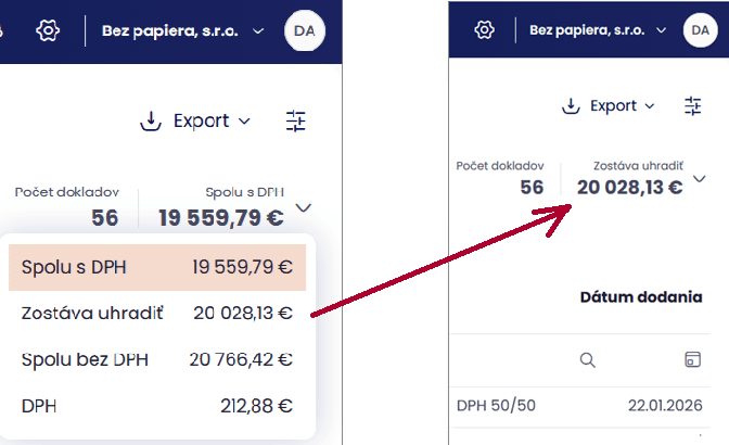 V pravom hornom rohu nájdeme informáciu o celkovom súčte zobrazených dokladov. Kliknutím na ikonu šípky sa otvorí detailnejší prehľad a ak si vyberieme konkrétny riadok, napr. Zostáva uhradiť, prenesie sa do základného zobrazenia.