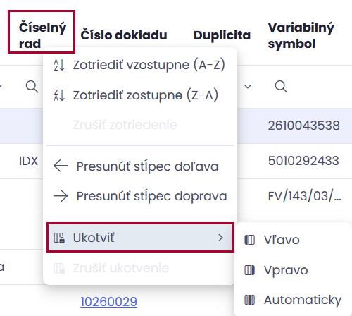 Ak chceme v tabuľkovom zobrazení umiestniť niektorý stĺpec napevno, môžeme ho jednoducho ukotviť. Stačí kliknúť pravým tlačidlom myši na zvolený stĺpec v hlavičke tabuľky a vybrať možnosť Ukotviť – buď Vľavo, Vpravo, alebo Automaticky.