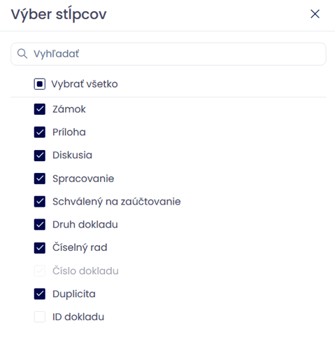 V záložke Účtovné doklady si môžeme nastaviť stĺpce, ktoré pri svojej práci budeme potrebovať najčastejšie. Zmenu vykonáme cez ikonu Nastavenie zobrazenia v pravej hornej časti formulára, po kliknutí na voľbu Výber stĺpcov. Následne sa zobrazí zoznam všetkých dostupných stĺpcov a zaklikneme tie, ktoré chceme v aplikácii zobraziť.
