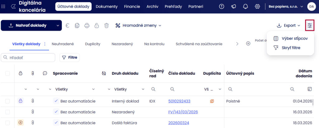 S dokladmi môžeme pracovať detailnejšie, personalizovať zobrazenie tabuľky podľa vlastných kritérií a filtrovať údaje efektívnejšie.