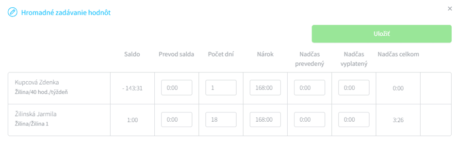 Možnosť Hromadné zadanie hodnôt Vám umožní rýchlu editáciu hodnôt, ktoré sa prenášajú do mesačného súhrnu výkazu.