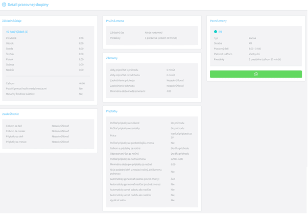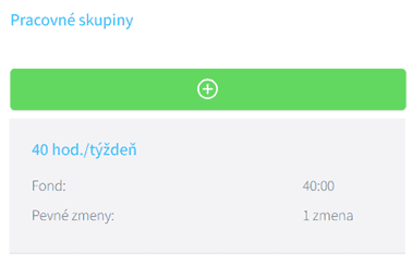 Nastavením pracovnej skupiny upravujete zmeny a pracovný čas pre jednotlivé skupiny zamestnancov, vrátane automatických prestávok a zaokrúhlenia. V tejto kapitole nájdete návod, ako nastaviť pracovné skupiny pre zamestnancov s rovnomerne rozvrhnutým pracovným časom.
