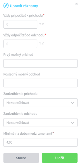 V detaile môžete editovať, či sa má zamestnancovi k príchodu pripočítať alebo pri odchode odpočítať nejaký čas, ktorý nastavíte v minútach.