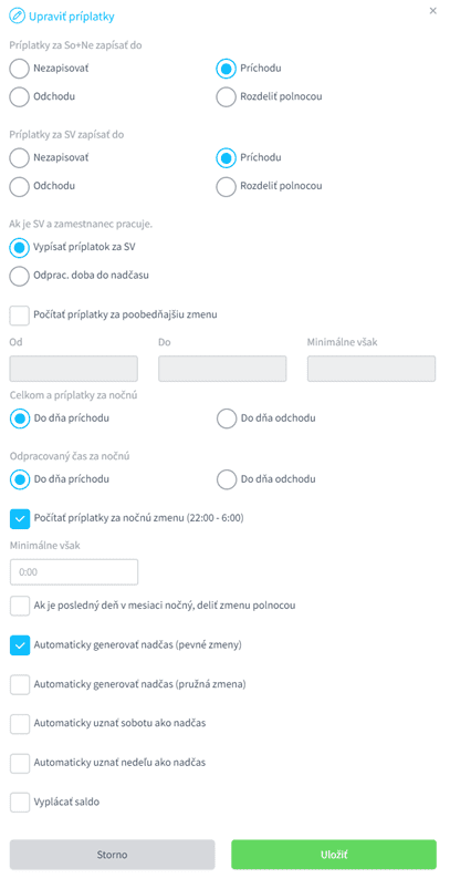 V príplatkoch si môžete nastaviť, ako sa majú jednotlivé príplatky zamestnancov zapisovať v ich výkazoch. Voľba Minimálne znamená, aký čas musí minimálne zamestnanec odpracovať, aby mal nárok na príplatok. Voľba Automaticky generovať nadčas (pevné zmeny) znamená, že program automaticky prizná nadčas iba v prípade, že rozpozná pevné zmeny. Ak chcete automaticky priznávať nárok na nadčas aj pri pružnej zmene, zvoľte možnosť Automaticky generovať nadčas (pružná zmena). Voľby Automaticky uznať sobotu ako nadčas a Automaticky uznať nedeľu ako nadčas znamená, že program automaticky prizná nadčas za tieto dni.