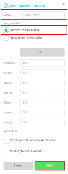 Zobrazí sa Vám možnosť Vytvoriť pracovnú skupinu. Do poľa Názov je potrebné vyplniť názov danej pracovnej skupiny a označiť voľbu Rovnomerný prac. čas. Základom je zvolenie si týždenného pracovného fondu pre danú pracovnú skupinu.