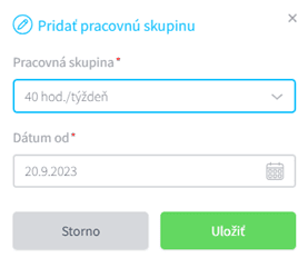 Následne sa Vám zobrazí okno, v ktorom si z rozbaľovacieho menu vyberiete pracovnú skupinu, do ktorej chcete zamestnanca priradiť a zvolíte deň, od ktorého bude zamestnanec do danej pracovnej skupiny priradený. Nastavenie skupiny uložíte cez tlačidlo Uložiť.