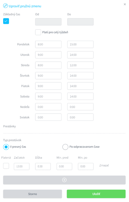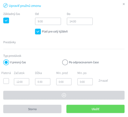 Ak nebude do pracovnej skupiny pridaná pevná zmena, bude daná skupina zamestnancov pracovať na pružný pracovný čas. V tomto prípade môžete zvoliť základný pracovný čas, čiže čas odkedy dokedy by mali byť zamestnanci v práci, a tiež možnosť generovania automatickej prestávky, kde si volíte, či bude prestávka každý deň v rovnaký čas, alebo sa bude generovať po určenom odpracovanom čase.